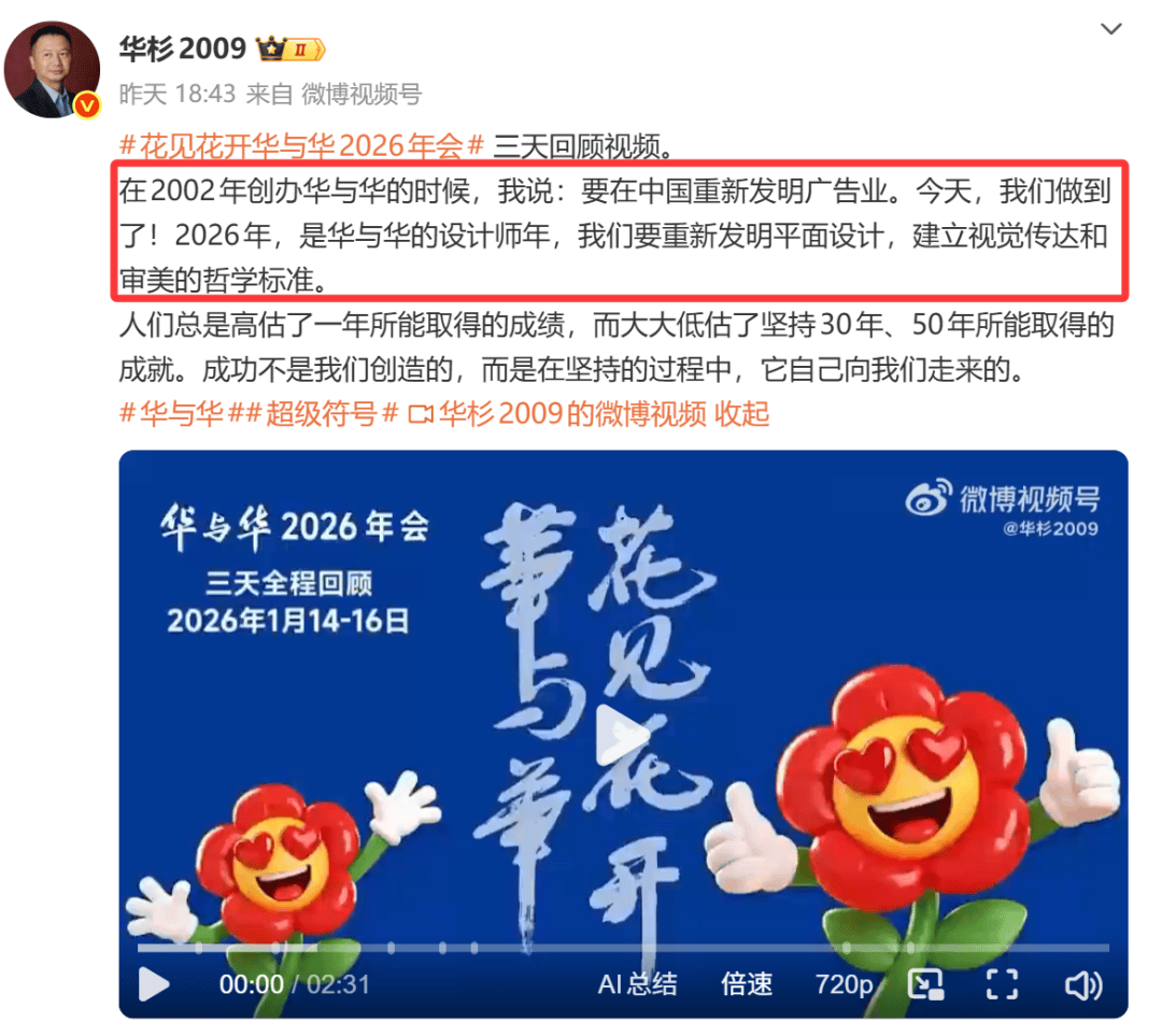 而在前几天2026年华与华“花见花开”的年会上,创始人华杉高调宣称:在2002年创办华与华的时候,我说:要在中国重新发明广告业。今天,我们做到了!